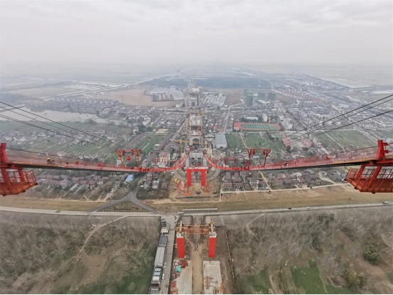 在長江水域之上,G3大橋南北主塔遙遙相望,由貓道和一根根纜索構成的“紅色長龍”將南北兩岸緊緊相連,跨江大橋雄姿初現,預計2024年2月初完成主纜架設。