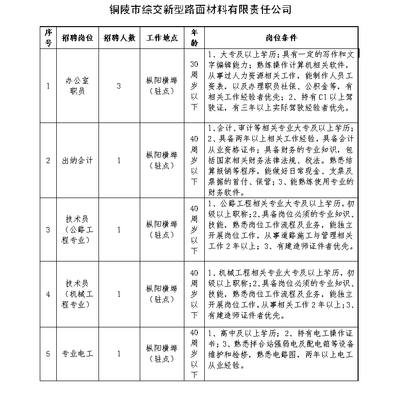 因業務發展需要,我公司司屬公司銅陵市綜交新型路面材料有限責任公司、銅陵交投再生資源綜合利用有限公司現面向社會公開招聘若干名工作人員,具體事項公告如下: