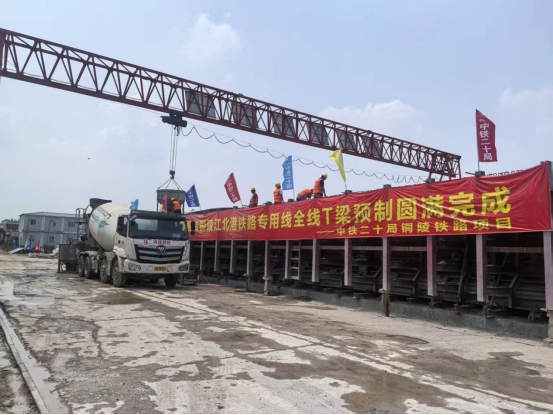 5月26日,隨著最后一車混凝土緩緩注入模板,銅陵江北港鐵路專用線項目中鐵二十局廬江制梁場順利完成最后一片T梁澆筑任務。至此,銅陵江北港鐵路專用線項目全線1192片T梁預制任務圓滿收官,標志著項目土建施工取得重大進展,橋梁上部結構施工步入全面沖刺階段。